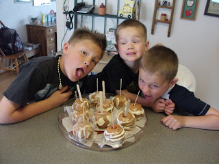 First off, a Boy's Only Hike with Jeff. Jeff has taken the boys out on hikes from time to time and he always carried a walking stick, which the boys would want to take turns holding. So he made them each one, with their names engraved and specifically for their height. When the day of the hike finally arrived, we met at a trail behind the Draper temple and off they went. They were gone for a good 2 1/2 hours and came back exhausted. The boys got hot while hiking, so Jeff taught them to dip their hat in the stream. He told Em that after he taught them that, they would run and dip their hat into every stream they passed by. Cameron and Gavin decided to get their heads wet one time, so Jeff held Owen by his ankles so he could get his hair wet too, without falling in. Jeff said that they all did really good on the hike and didn't whine at all! That, in itself, is a miracle!